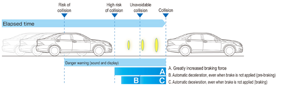The newly developed PCS uses millimeter-wave radar to detect the risk of a rear-end collision with a preceding vehicle, with the system warning the driver via sound and display alerts to prompt braking when such a risk is detected.  When the driver applies the brakes, PCS enables deceleration of up to 60 km/h*2 by greatly increasing the braking force up to twice*3 that of the average force applied by drivers.  If the brakes are not applied, automatic deceleration*4 of 15 km/h to approximately 30 km/h*5 is possible*6.