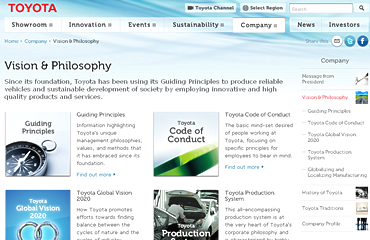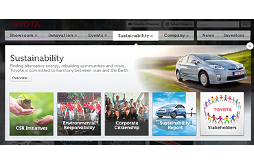 "Emblem"―close-up look at evolution of Toyota-brand vehicle emblems "Vehicle Gallery"―photo collection of Toyota-brand vehicles around world "Vehicle Design" and "Design Philosophy"―explanation of Toyota-brand design concepts and design philosophies |