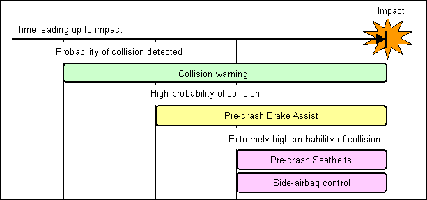 | Side-airbag control | If system determines very high probability of a side-on collision, the Supplemental Restraint System (SRS) side airbags and SRS curtain shield airbags prepare for deployment |