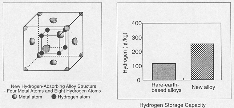 Hydrogen-absorbing alloys, which make possible the compact and stable storage of hydrogen at ordinary temperature, are well suited for use in hydrogen storage units. Additionally, the application of alloys in such devices as heat pumps for air-conditioning units and thermal storage units is also being researched and developed.Rare-earth-based hydrogen-absorbing alloys, which are currently being used mainly in nickel-metal hydride batteries, have superior hydrogen absorption and desorption rates. However, they are handicapped by their limited hydrogen storage capacities.To reduce the size and weight of hydrogen-absorbing alloys, researchers have been studying titanium-based alloys with body-centered cubic (BCC) structures, magnesium-based alloys, and other materials that appear to have the potential to compactly store large amounts of hydrogen.