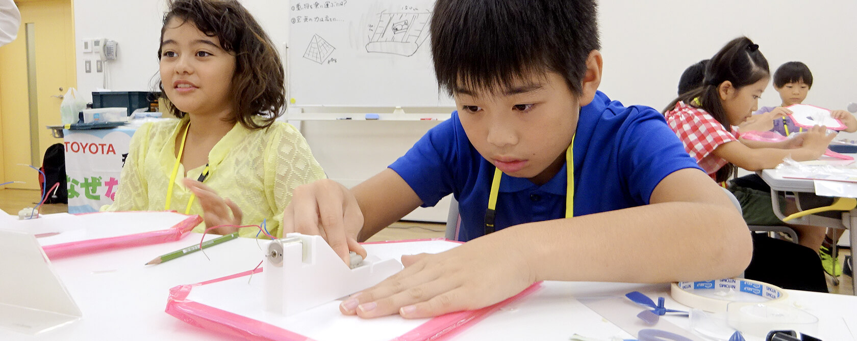 普段クルマの研究開発や設計、デザインなどをしているトヨタ自動車の社員が専門分野の知識を活かし、子どもたちが自らの力で作り上げていく過程を大切に、モノづくりを通じて試行錯誤することで探求心や創造性を育むSTEAM教育に取り組んでいます。
