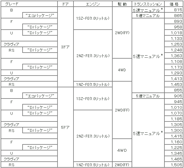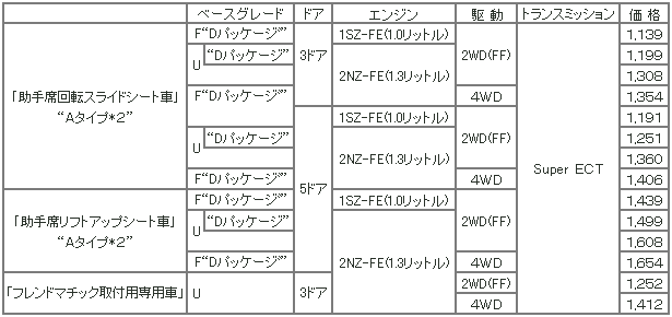このほか、Uグレードはエンジンを1.0リットルから1.3リットル(2NZ-FE)に変更するとともに、オートエアコンの切り替え操作モードを追加したほか、装備を厳選しお求めやすい価格のU"Dパッケージ"(F"Dパッケージ"と同一装備)を新設定。