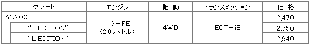 | 車 名 | エンジン | 駆 動 | トランスミッション | 価 格 |