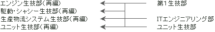 生技開発部 ユニット生技部 計測技術部 第1生技部 第4生技部 第5生技部 貞宝工場(工場長) 貞宝工場工機管理部 メカトロシステム部 ITエンジニアリング部 ダイエンジニアリング部 |