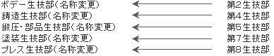 車両生技部 組立生技部 第2生技部 第6生技部 第7生技部 第8生技部 スタンピングツール部 |