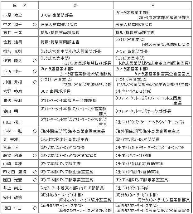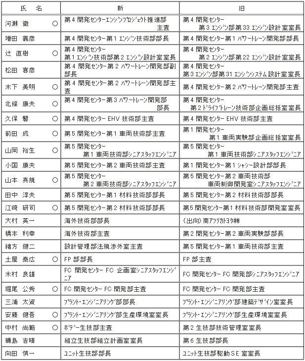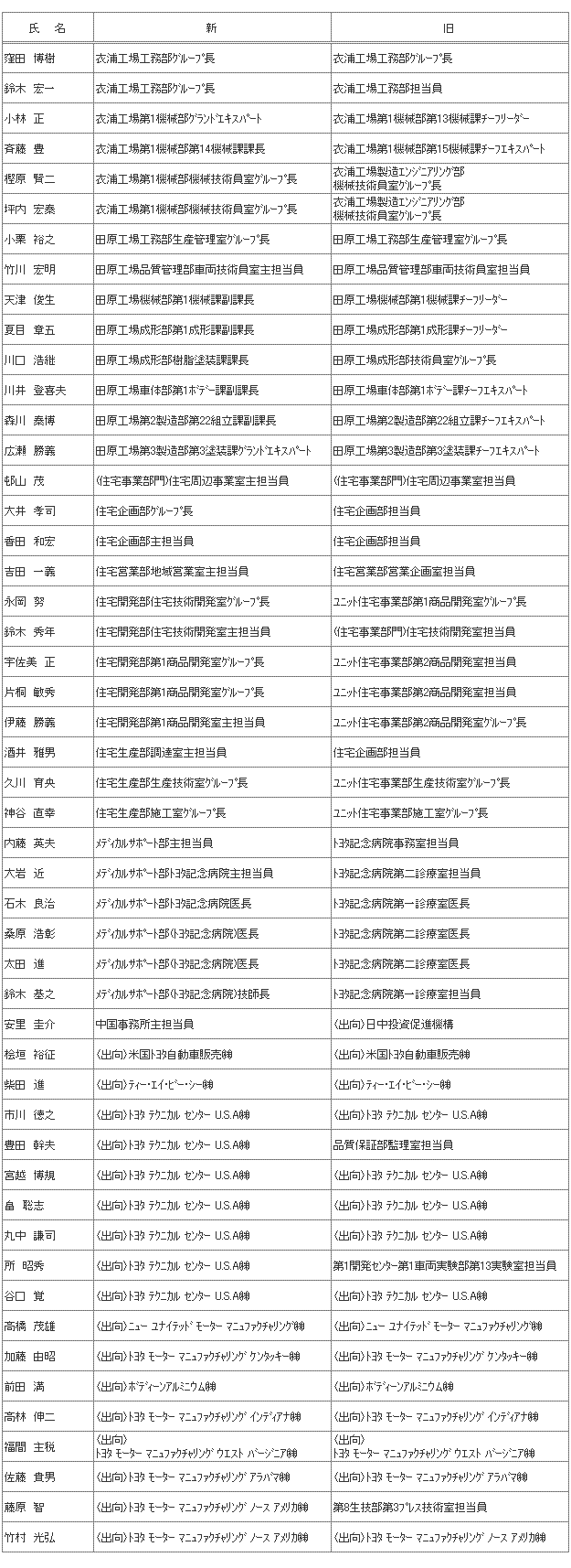 トヨタ自動車(株)は、2003年1月1日付で、下記のとおり、組織の改正及び人事異動を行う。