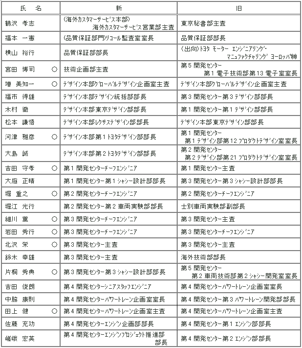 技術企画部 技術管理部 第1開発センター 第2開発センター 第3開発センター 海外技術部 設計管理部 知的財産部 試作部 東京技術部 士別車両実験部 FC開発センター(センター長) 商品企画部(統括) |
