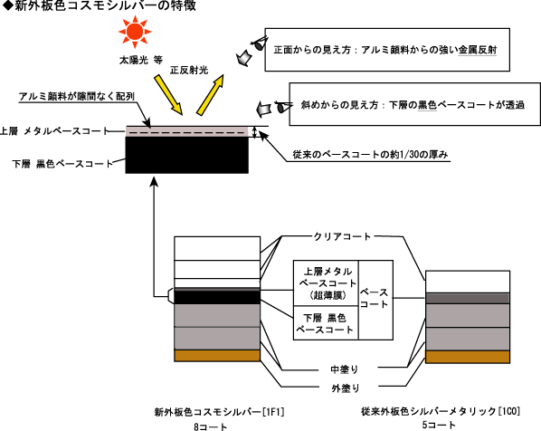 | 新設定の専用外板色コスモシルバーは、色を付与するベースコートを、黒色ベースコートに、メタル ベースコートを重ねた複層構造としており、上層のメタルベースコートは、従来の約30分の1という極めて薄い塗装膜に、表面がより平滑なアルミ顔料を隙間なく配列させている。これにより、光の当たり方や見る位置によって、アルミ顔料の強い金属反射やメタルベースコート下層の黒色ベースコートが透過して見えることで、深みのある立体的な風合いを引き出し、スタイリングを引き締め、ボディ形状のメリハリを強調している。さらに、多層塗装との組み合わせにより、クリアコートを重ねることで、金属の塊を磨き込んで造ったような緻密で艶やかな質感を実現している。 |